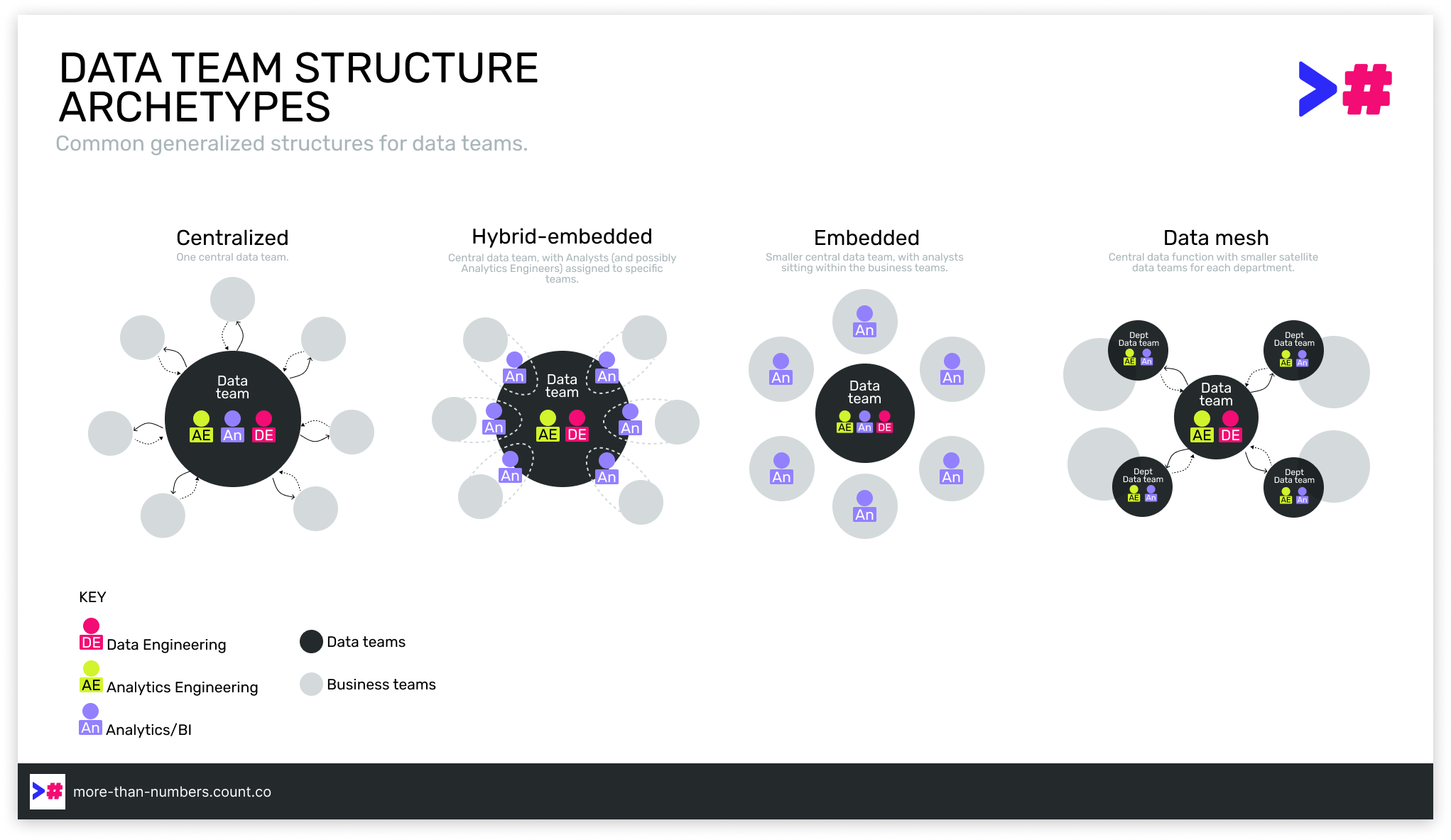 As a reminder, embedded teams are those in which the analysts (sometimes other roles too) sit within the business teams they support. There is only a dotted line connecting them to the central data team: