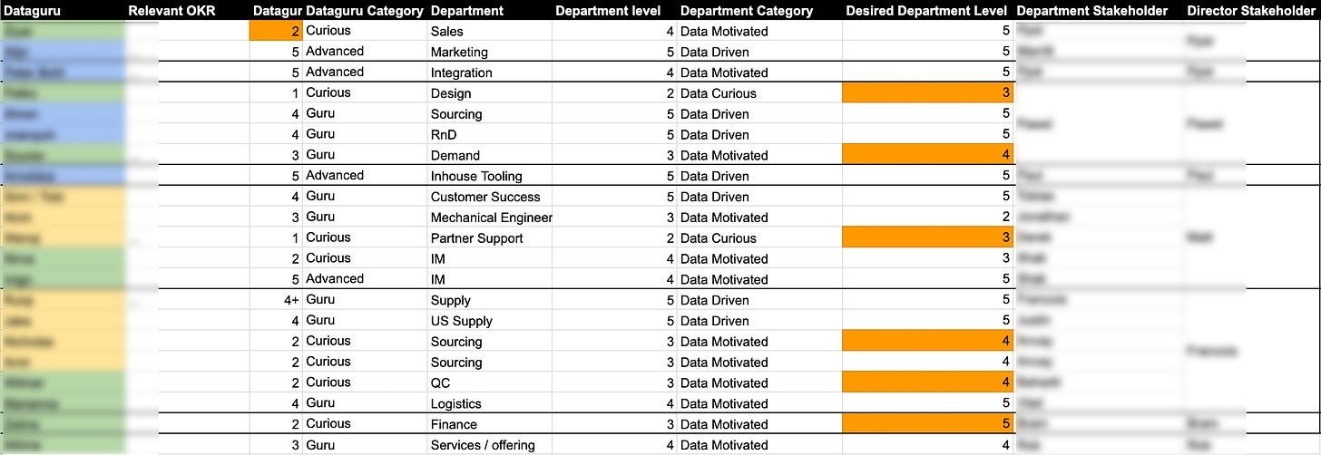 We also have a robust review process, which we call a. During this time, we score each Guru on a scale of 1 to 5. We also score their department to work out how data-driven that department should be. For example, marketing is a level 5, they need to be very data-driven, so they need a Data Guru at least at a level 5. If the marketing data Guru is below a 5 then we step in and help that Guru up-skill with training, or doing working sessions together.