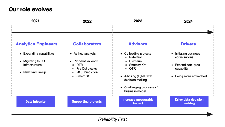 Their core responsibilities were to create and maintain the data model, serve key reports and dashboards to the wider company, and provide a way for people to serve up their insights.