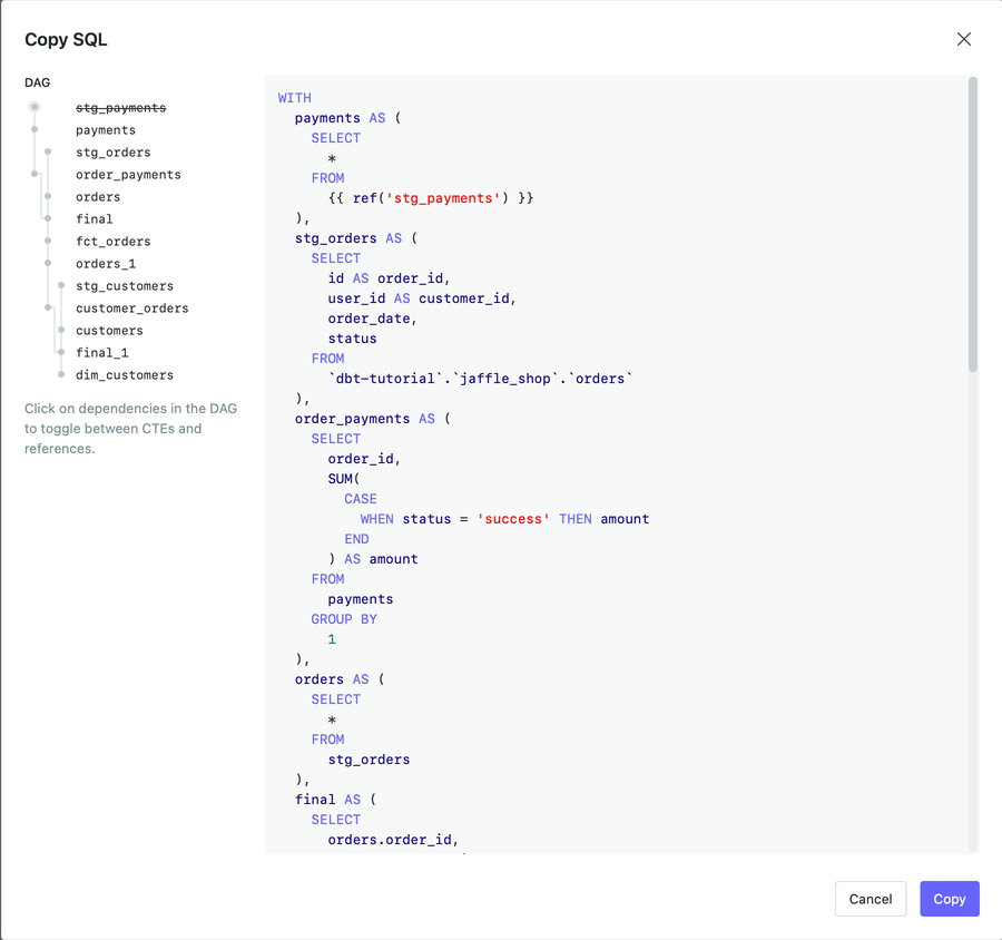 Within this pane, you can copy the compiled SQL of a cell out of the canvas. Using the options available, you can customize exactly which parts of your cell’s DAG should be replaced by references to other models, or which should stay as CTEs.