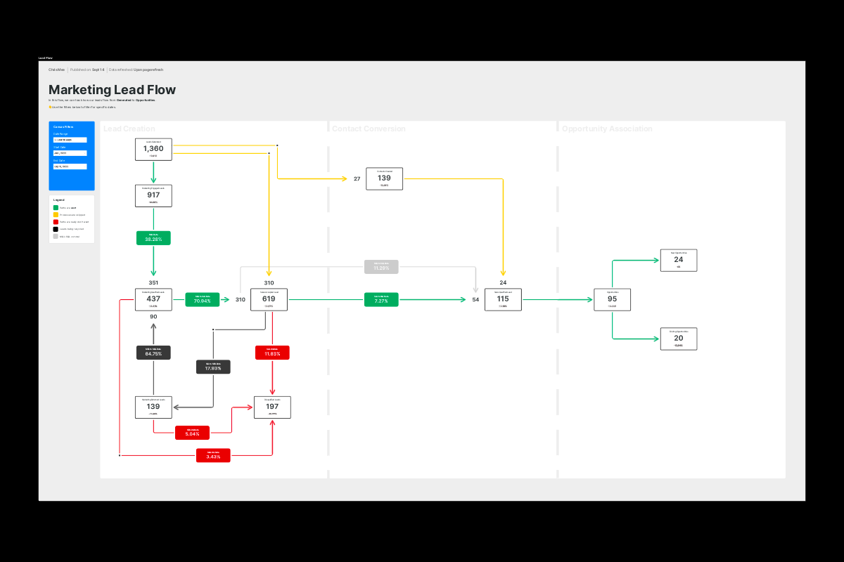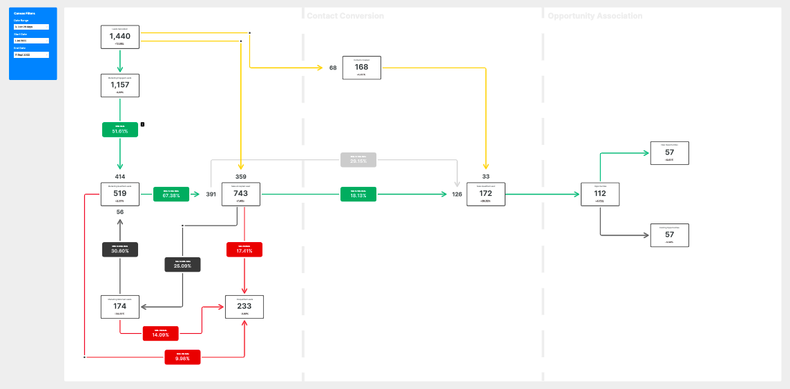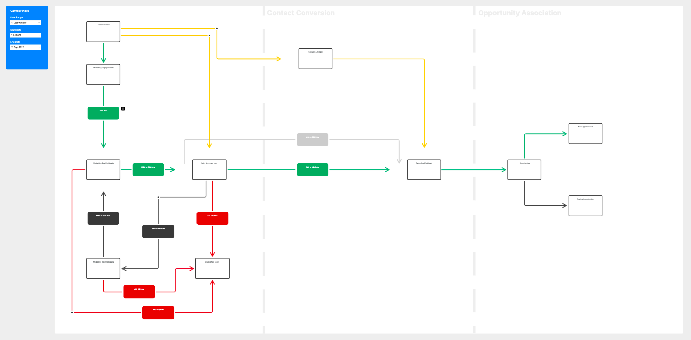 During the feedback sessions, we identified that the canvas and specifically the data being presented within the flow made more sense to people who were directly involved in the management of the lead process. To other users, it was quite confusing and hard to focus on the most important aspect, the movement of net new leads to sales qualified leads.