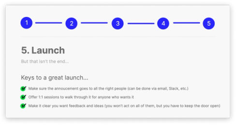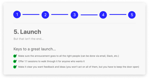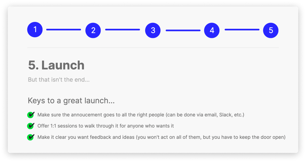 This can be done in either an email or slack message. I decided to go with a slack message and asked the team to schedule 1 to 1 sessions to go through it in more detail if they felt it was necessary.
