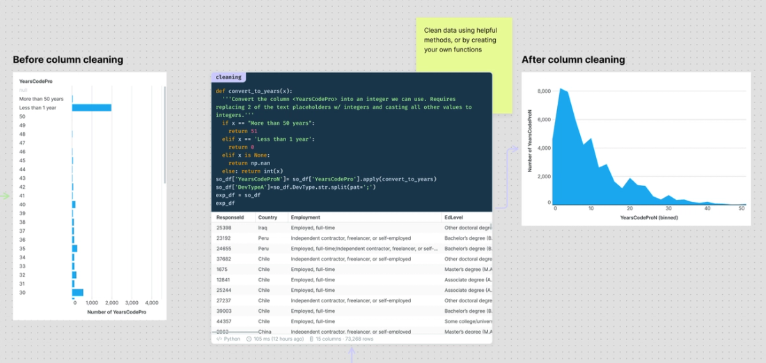 Using functions or built-in methods can help immensely when doing data transformation. In the example below we’re converting a string column to an integer with some bespoke logic. We can then see the difference between the column before and after the distribution on either side of the Python cell.