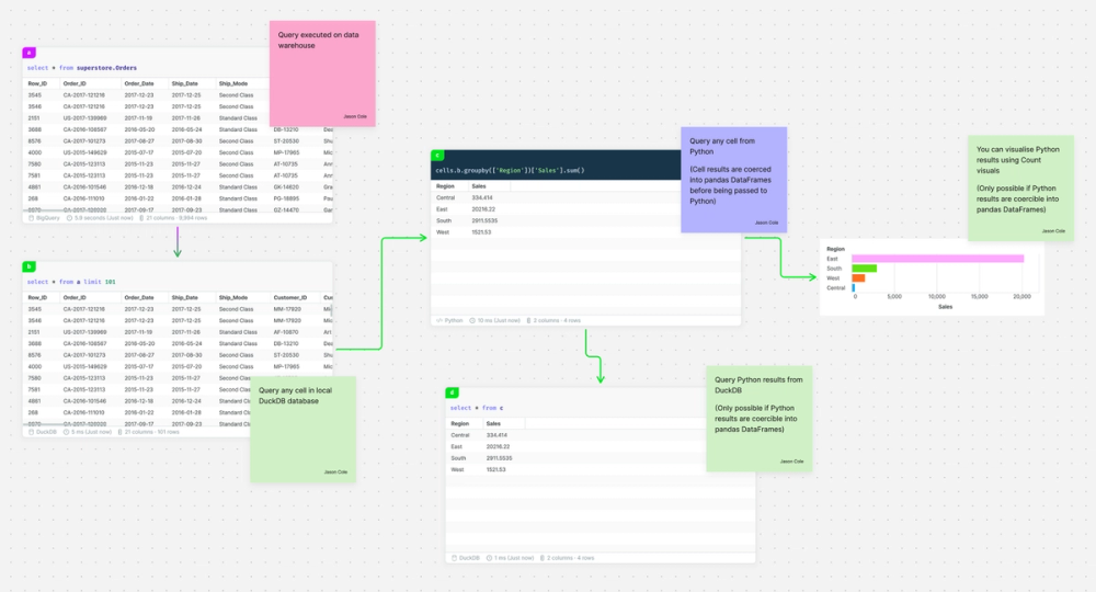 Our aim in bringing Python cells into the canvas is to reflect the way data teams work: use the best language for the job at each point in time, while having the flexibility of the canvas to lay everything out at once, and the transparency to communicate that with others.