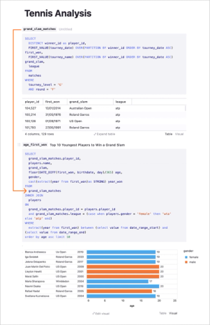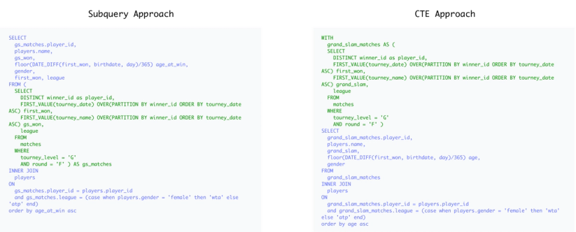 I can easily adjust my CTEgrand_slam_matchesto answer these questions, without having to worry if I’m making the changes in the right subquery.