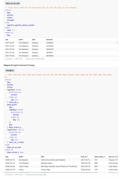 Example: I wanted to find the biggest droughts for Spotify artists between their #1 hits. To do that I: