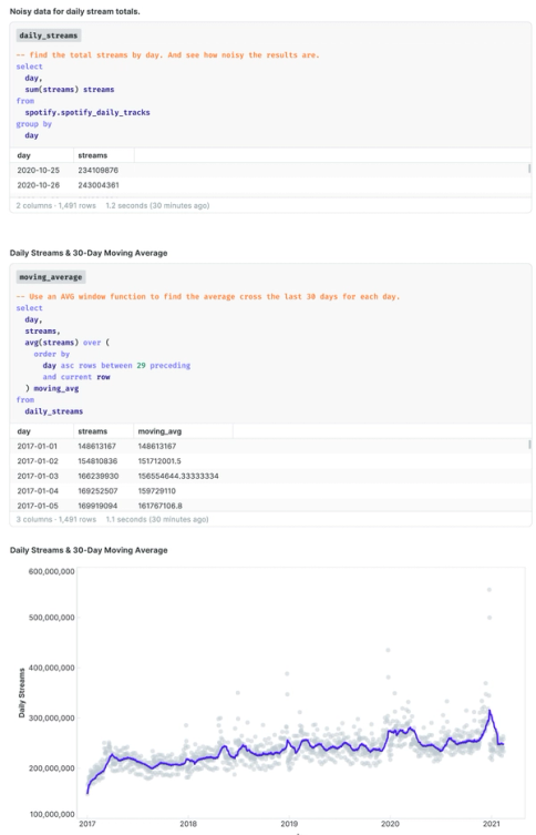Example: In this case, I want to see the daily Spotify streams by day with a 30 day moving average. This will let me quickly see if streams are increasing over time, and how many noticeable outliers are there, amongst other things.