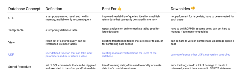 The implementation of UDFs will differ in every database you’re using (fun!), so be sure to check your own DB documentation before using them. But there are a few things they all have in common: