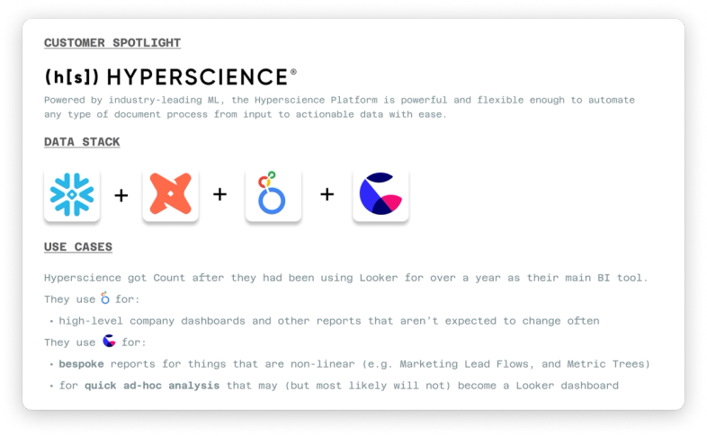 So if you have a traditional BI tool, you can keep using it for your traditional reporting, but when you need a more collaborative approach, use Count. TakeHyperscience, for example: