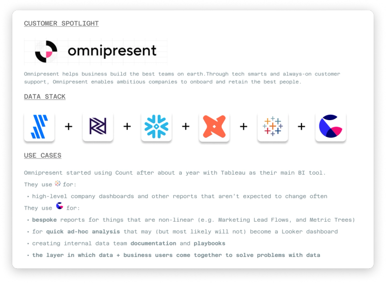 Omnipresent, who has quite a mature data stack, is currently using Count to address their Last Mile challenges: