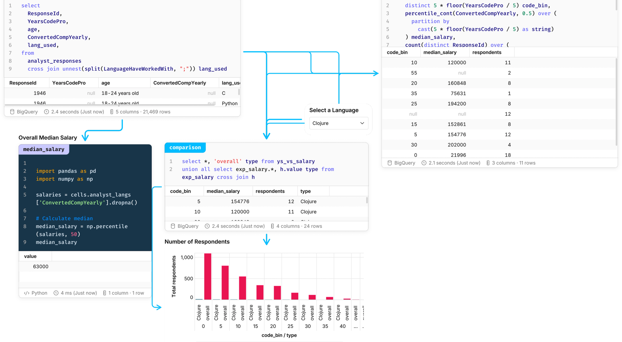 Canvases are a better superset of both of those dated approaches. You can work freely with cells as you would in a notebook, but unrestricted by layout: branch off to explore and validate, and move freely between SQL, Python and low-code tables and visualizations.