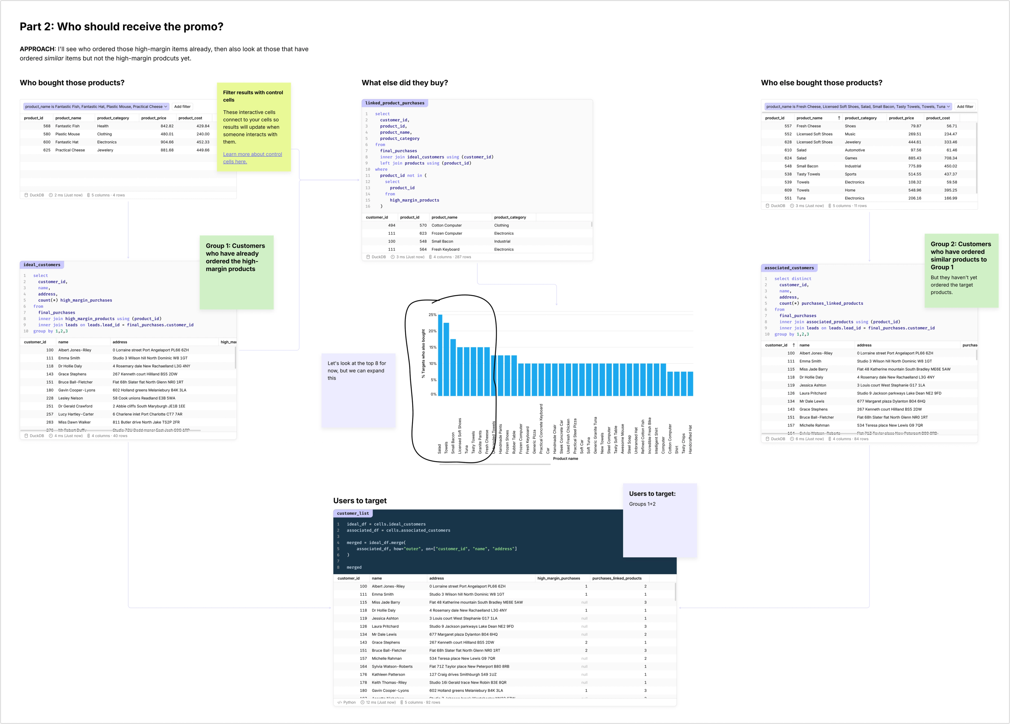 Canvases are a better superset of both of those dated approaches. You can work freely with cells as you would in a notebook, but unrestricted by layout: branch off to explore and validate, and move freely between SQL, Python and low-code tables and visualizations.